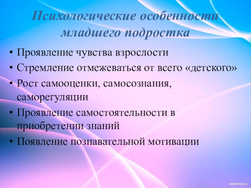 Психологические особенности младшего подросткаПроявление чувства взрослостиСтремление отмежеваться от всего «детского»Рост самооценки, самосознания, саморегуляцииПроявление самостоятельности в приобретении знанийПоявление