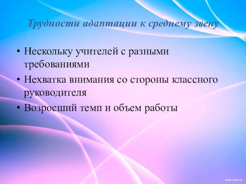 Трудности адаптации к среднему звенуНескольку учителей с разными требованиямиНехватка внимания со стороны классного руководителяВозросший темп и объем