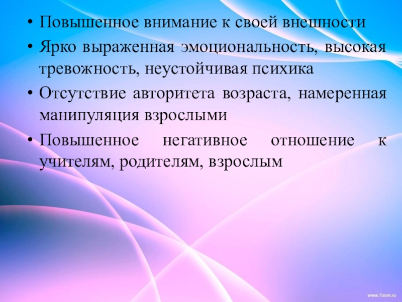 Повышенное внимание к своей внешностиЯрко выраженная эмоциональность, высокая тревожность, неустойчивая психикаОтсутствие авторитета возраста, намеренная манипуляция взрослымиПовышенное негативное
