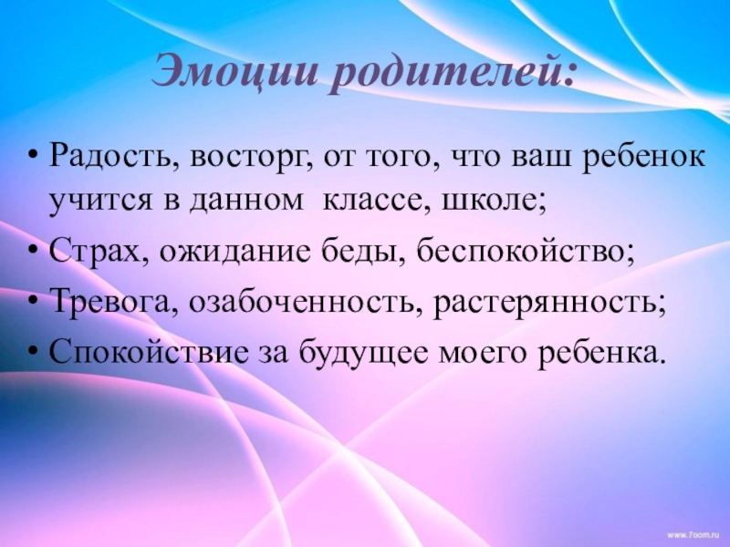 Эмоции родителей:Радость, восторг, от того, что ваш ребенок учится в данном классе, школе;Страх, ожидание беды, беспокойство;Тревога, озабоченность,