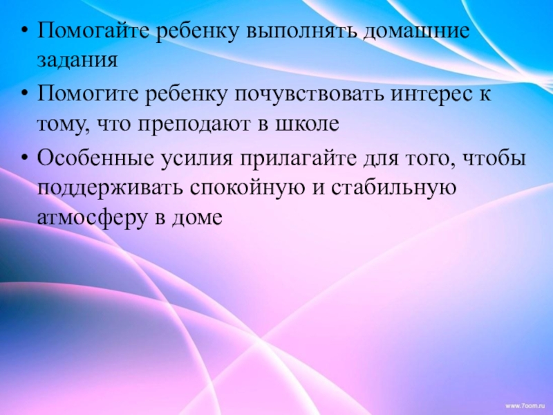 Помогайте ребенку выполнять домашние заданияПомогите ребенку почувствовать интерес к тому, что преподают в школеОсобенные усилия прилагайте для