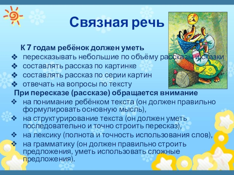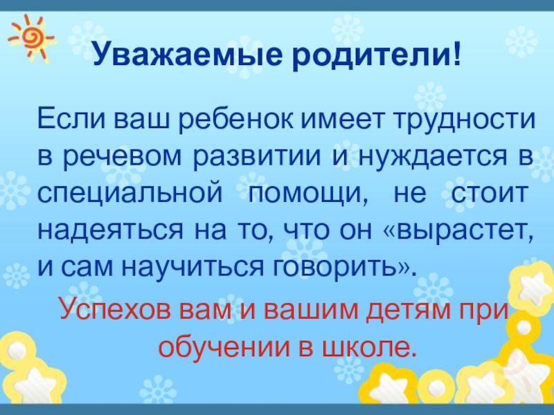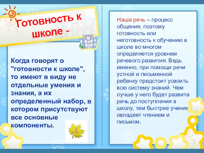 Наша речь – процесс общения, поэтому готовность или неготовность к обучению в школе во многом определяется уровнем речевого развития. Ведь именно, при помощи речи устной и письменной ребенку предстоит усвоить всю систему знаний. Чем лучше у него будет развита речь до поступления в школу, тем быстрее ученик овладеет чтением и письмом.