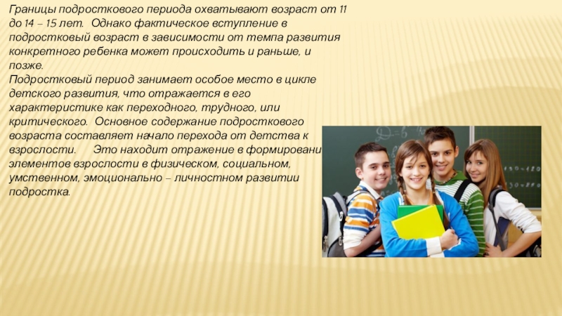 лет. Однако фактическое вступление в подростковый возраст в зависимости от темпа развития конкретного ребенка может происходить и раньше, и позже.
