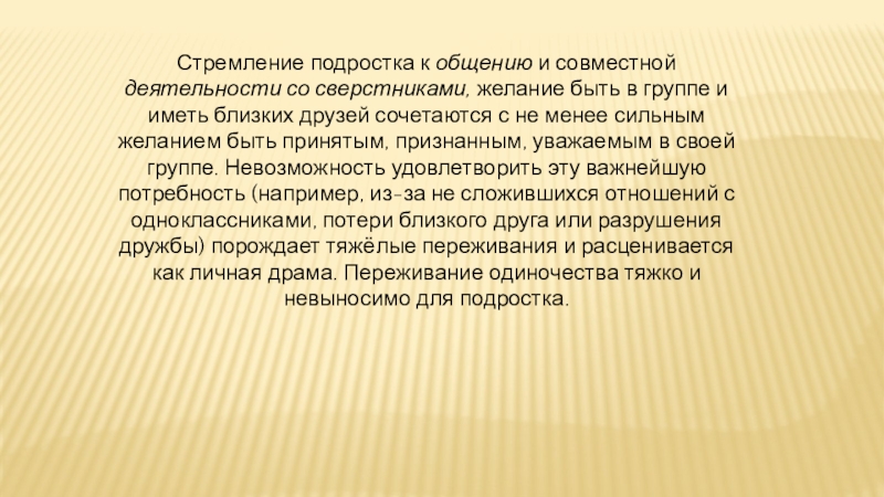 в группе и иметь близких друзей сочетаются с не менее сильным желанием быть принятым, признанным, уважаемым в своей группе. Невозможность удовлетворить эту важнейшую потребность (например, из-за не сложившихся отношений с одноклассниками, потери близкого друга или разрушения дружбы) порождает тяжёлые переживания и расценивается как личная драма. Переживание одиночества тяжко и невыносимо для подростка.