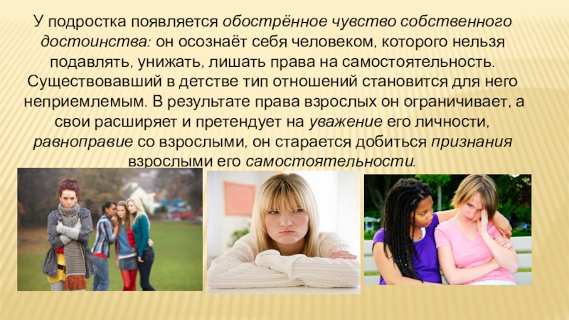 которого нельзя подавлять, унижать, лишать права на самостоятельность. Существовавший в детстве тип отношений становится для него неприемлемым. В результате права взрослых он ограничивает, а свои расширяет и претендует на уважение его личности, равноправие со взрослыми, он старается добиться признания взрослыми его самостоятельности.
