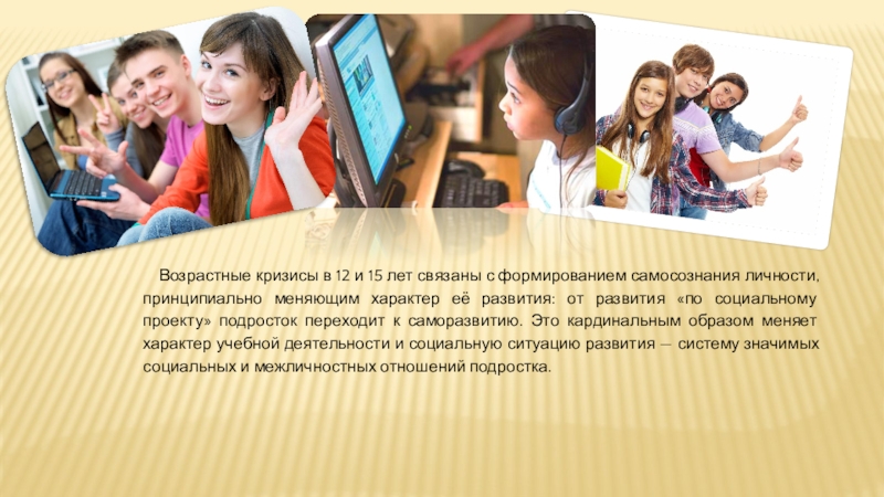 Слайд 7Возрастные кризисы в 12 и 15 лет связаны с формированием самосознания