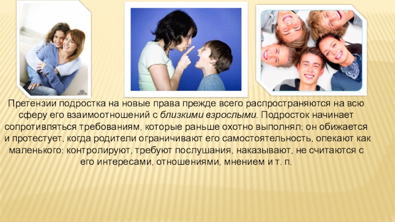 Слайд 18Претензии подростка на новые права прежде всего распространяются на всю сферу