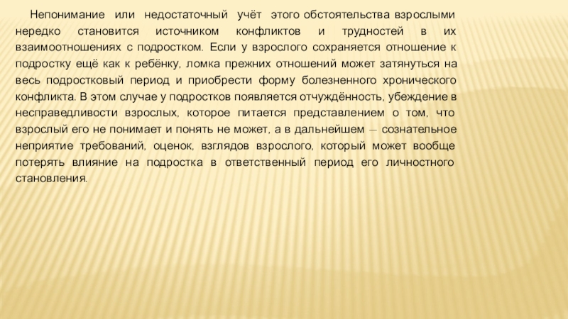 конфликтов и трудностей в их взаимоотношениях с подростком. Если у взрослого сохраняется отношение к подростку ещё как к ребёнку, ломка прежних отношений может затянуться на весь подростковый период и приобрести форму болезненного хронического конфликта. В этом случае у подростков появляется отчуждённость, убеждение в несправедливости взрослых, которое питается представлением о том, что взрослый его не понимает и понять не может, а в дальнейшем — сознательное неприятие требований, оценок, взглядов взрослого, который может вообще потерять влияние на подростка в ответственный период его личностного становления.