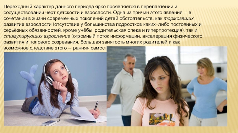 детскости и взрослости. Одна из причин этого явления — в сочетании в жизни современных поколений детей обстоятельств, как тормозящих развитие взрослости (отсутствие у большинства подростков каких-либо постоянных и серьёзных обязанностей, кроме учёбы, родительская опека и гиперпротекция), так и стимулирующих взросление (огромный поток информации, акселерация физического развития и полового созревания, большая занятость многих родителей и как возможное следствие этого — ранняя самостоятельность детей).