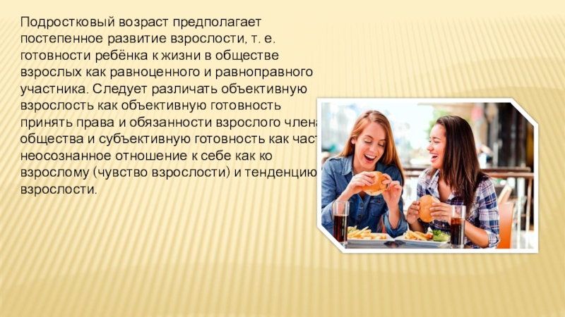 Слайд 14Подростковый возраст предполагает постепенное развитие взрослости, т. е. готовности ребёнка к