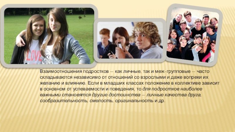 Слайд 28Взаимоотношения подростков — как личные, так и меж-групповые — часто складываются