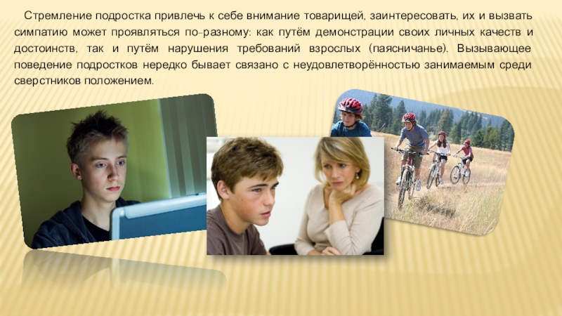 Слайд 27Стремление подростка привлечь к себе внимание товарищей, заинтересовать, их и вызвать