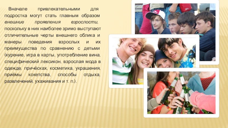 Слайд 13Вначале привлекательными для подростка могут стать главным образом внешние проявления взрослости,