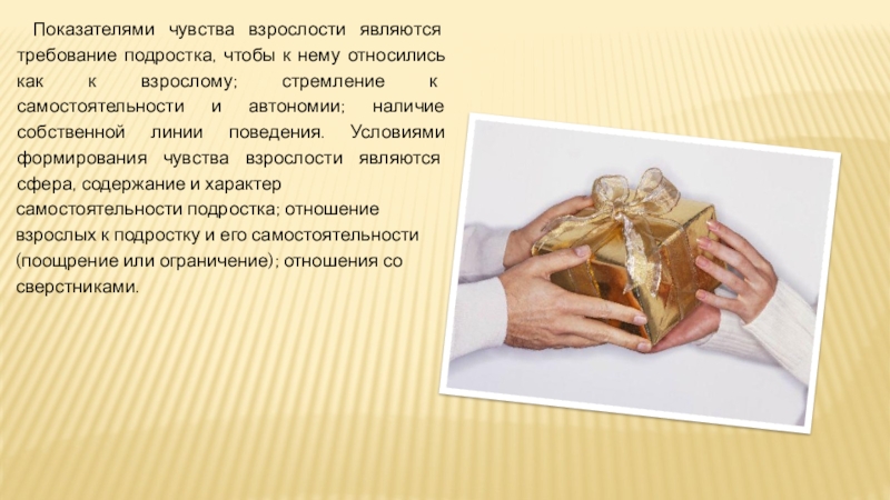 Слайд 16Показателями чувства взрослости являются требование подростка, чтобы к нему относились как