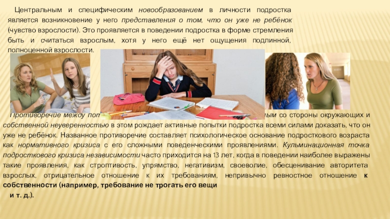 Противоречие между потребностью подростка в признании его взрослым со стороны окружающих и собственной неуверенностью в этом рождает активные попытки подростка всеми силами доказать, что он уже не ребёнок. Названное противоречие составляет психологическое основание подросткового возраста как нормативного кризиса с его сложными поведенческими проявлениями. Кульминационная точка подросткового кризиса независимости часто приходится на 13 лет, когда в поведении наиболее выражены такие проявления, как строптивость, упрямство, негативизм, своеволие, обесценивание авторитета взрослых, отрицательное отношение к их требованиям, непривычно ревностное отношение к собственности (например, требование не трогать его вещи