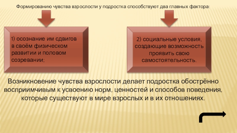 Слайд 11Формированию чувства взрослости у подростка способствуют два главных фактора: