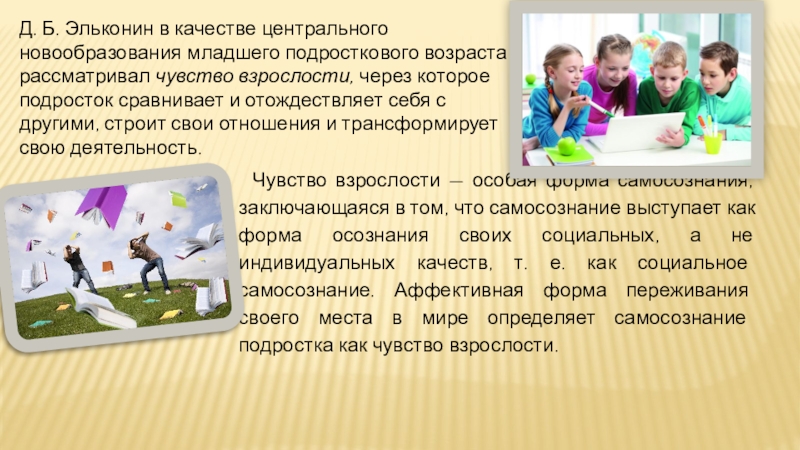Слайд 9Д. Б. Эльконин в качестве центрального новообразования младшего подросткового возраста рассматривал