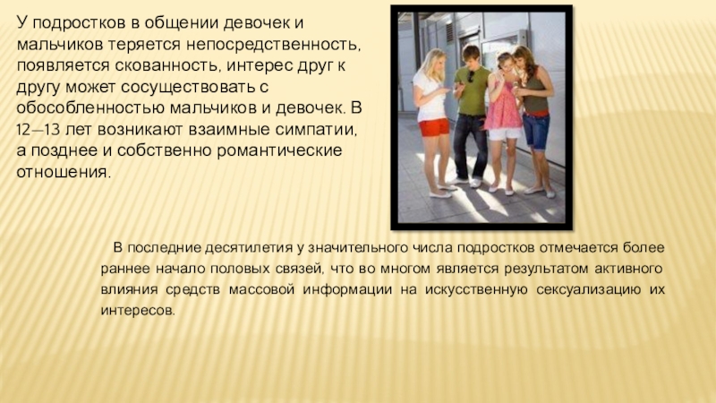 Слайд 30У подростков в общении девочек и мальчиков теряется непосредственность, появляется скованность,
