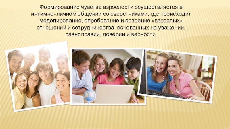 Слайд 24Формирование чувства взрослости осуществляется в интимно-личном общении со сверстниками, где происходит