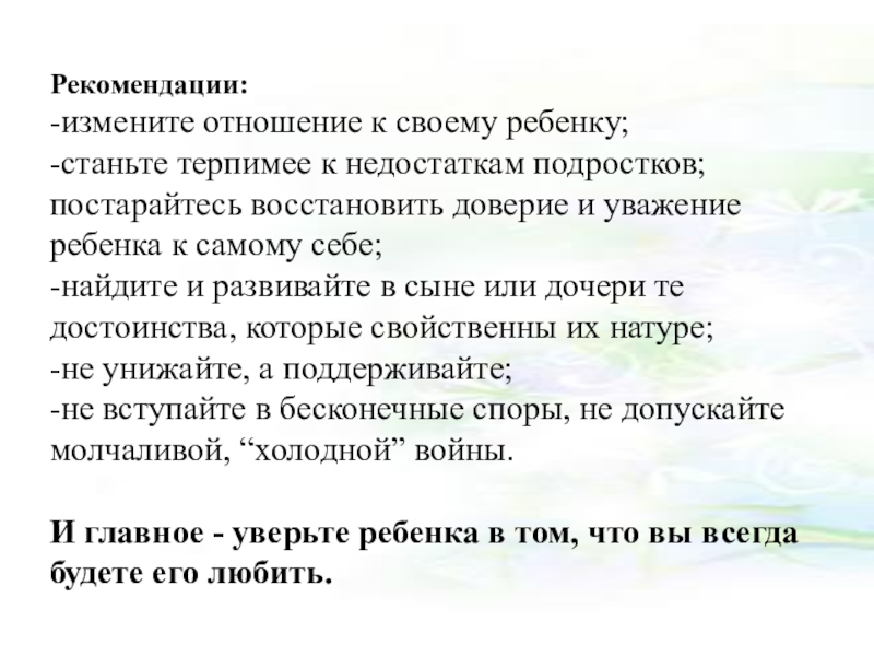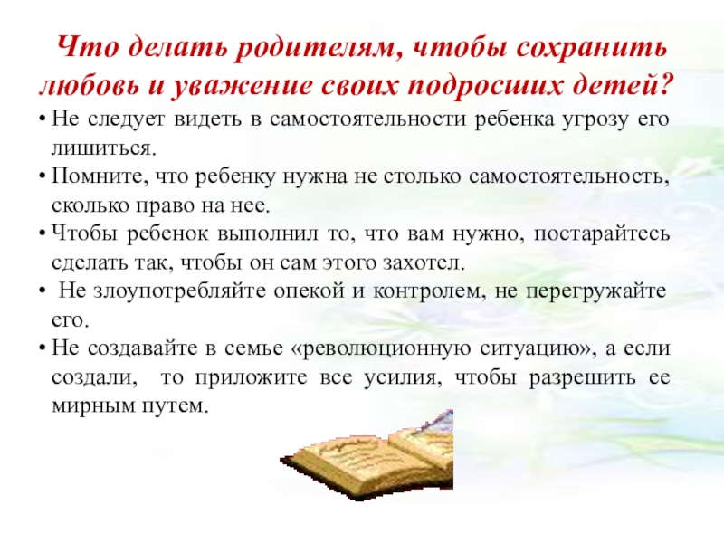 -не отказывайтесь от контроля, но сведите опеку к минимуму; --не требуйте от ребенка только правильных поступков, примите его таким, какой он есть;
