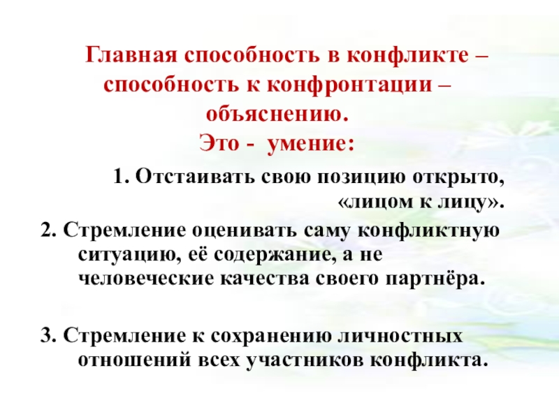 Слайд 4 Главная способность в конфликте –