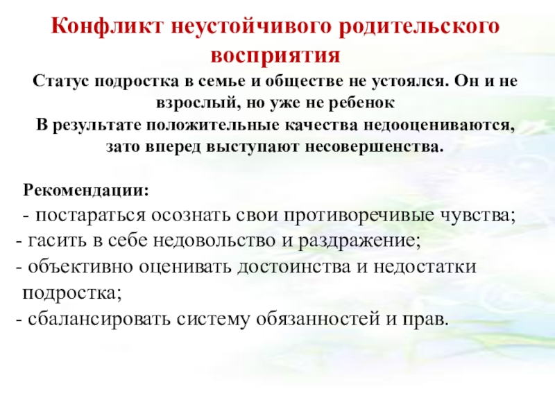 Слайд 8Конфликт неустойчивого родительского восприятия