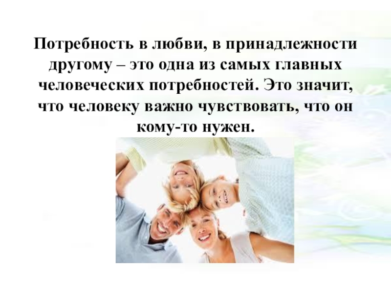 Слайд 7Потребность в любви, в принадлежности другому – это одна из самых