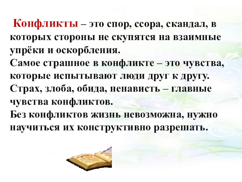 Слайд 3 Конфликты – это спор, ссора, скандал, в которых стороны не