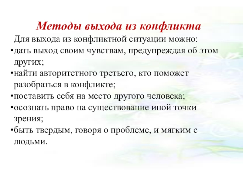 Слайд 14Методы выхода из конфликта