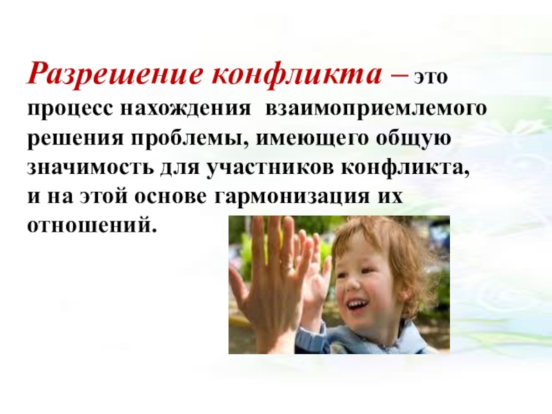 Слайд 18Разрешение конфликта – это процесс нахождения взаимоприемлемого решения проблемы, имеющего общую