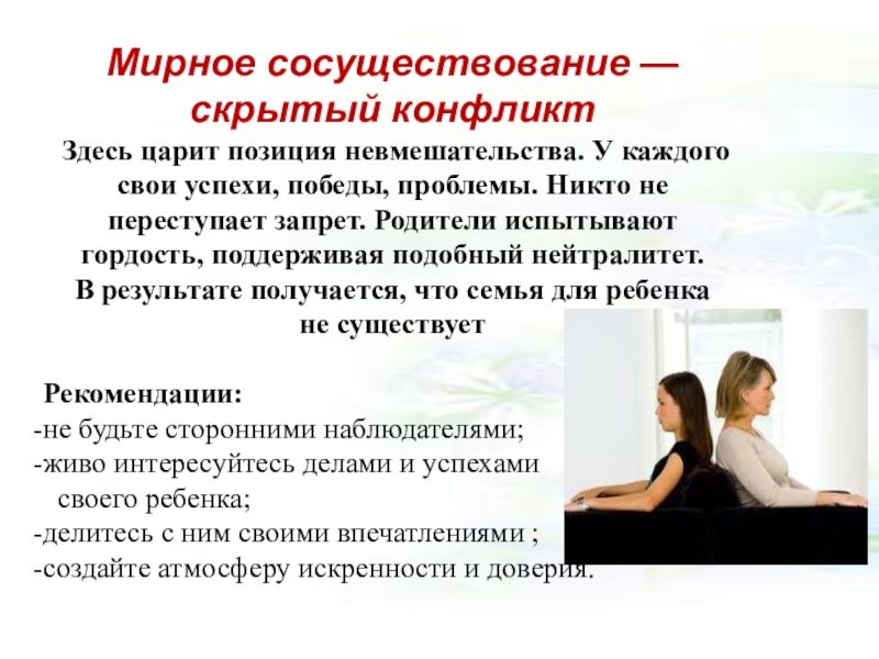 свои успехи, победы, проблемы. Никто не переступает запрет. Родители испытывают гордость, поддерживая подобный нейтралитет.