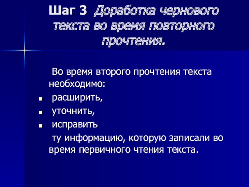 Слайд 9Шаг 3 Доработка чернового текста во время повторного прочтения.