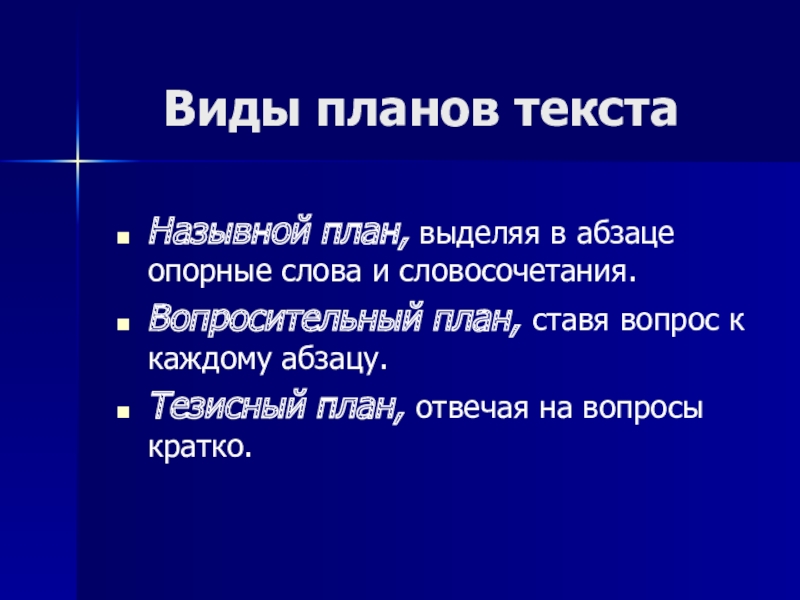 Назывной план, выделяя в абзаце опорные слова и словосочетания.