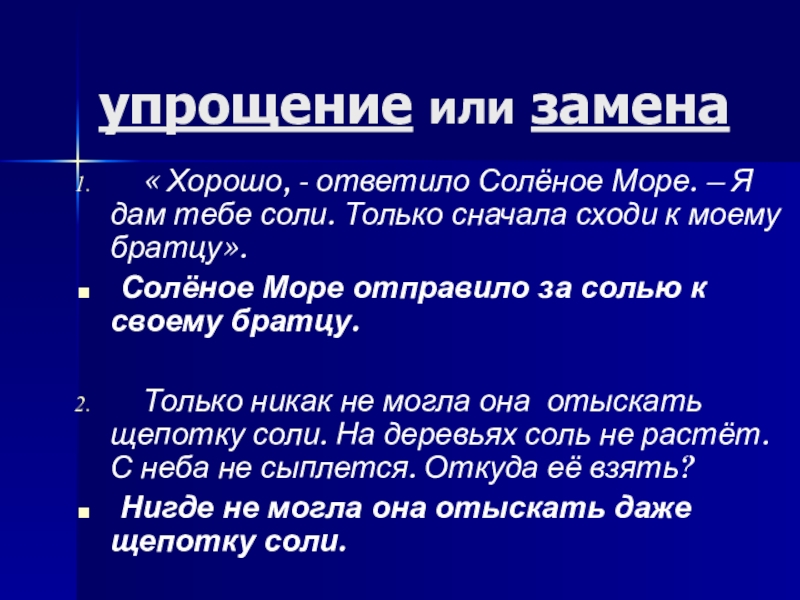 упрощение или замена (Заменяем прямую речь косвенной, осуществляем слияние двух-трёх сложных предложений в одно простое…)