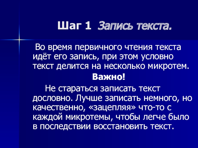 Не стараться записать текст дословно. Лучше записать немного, но качественно, «зацепляя» что-то с каждой микротемы, чтобы легче было в последствии восстановить текст.