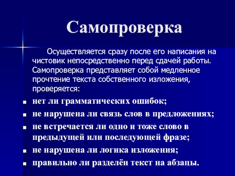 Самопроверка представляет собой медленное прочтение текста собственного изложения, проверяется: