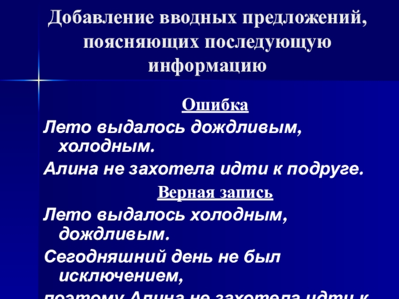 Слайд 16Добавление вводных предложений, поясняющих последующую информацию