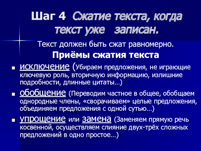 Слайд 10Шаг 4 Сжатие текста, когда текст уже записан.