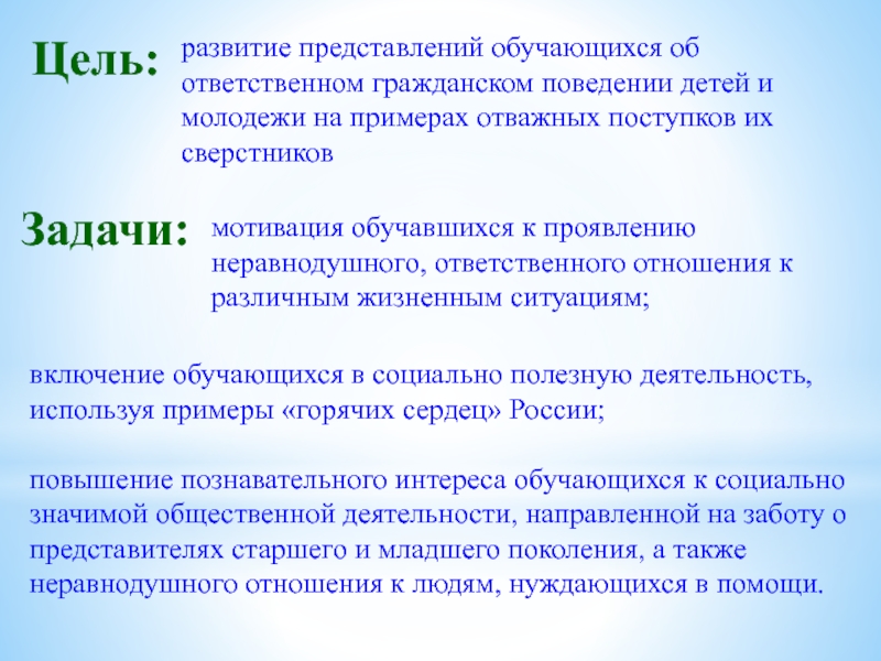 включение обучающихся в социально полезную деятельность, используя примеры «горячих сердец» России;