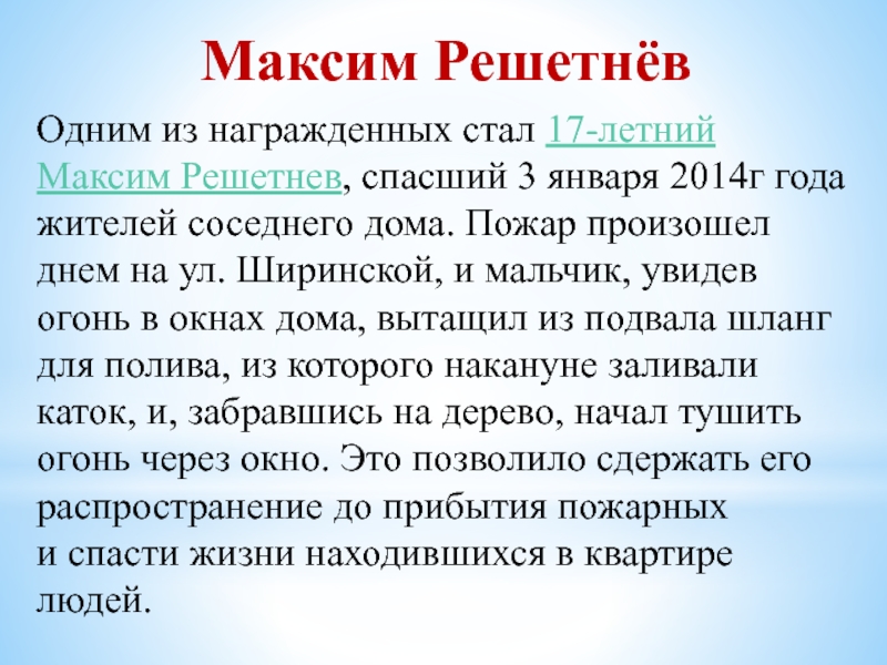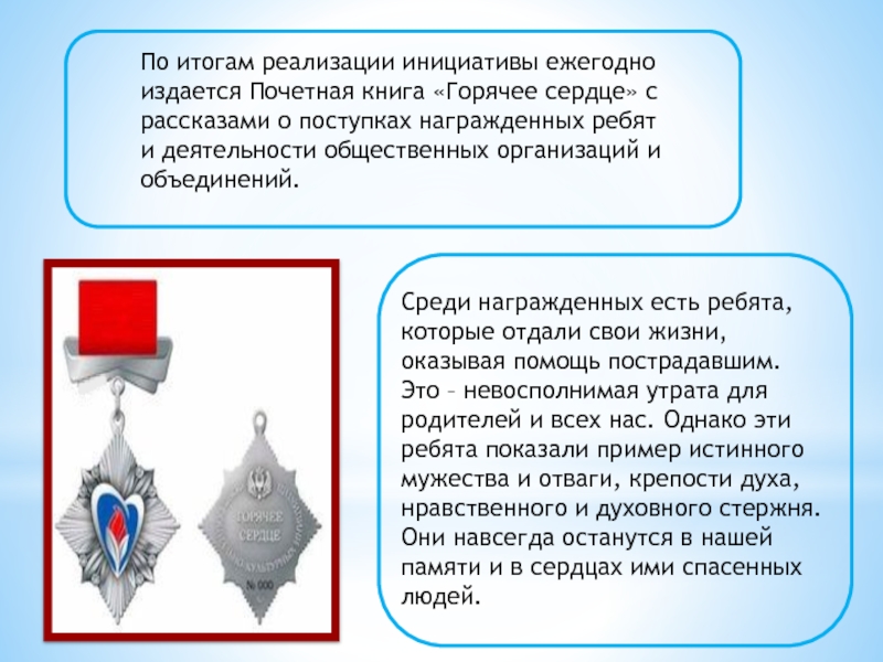 Среди награжденных есть ребята, которые отдали свои жизни, оказывая помощь пострадавшим. Это – невосполнимая утрата для родителей и всех нас. Однако эти ребята показали пример истинного мужества и отваги, крепости духа, нравственного и духовного стержня. Они навсегда останутся в нашей памяти и в сердцах ими спасенных людей.