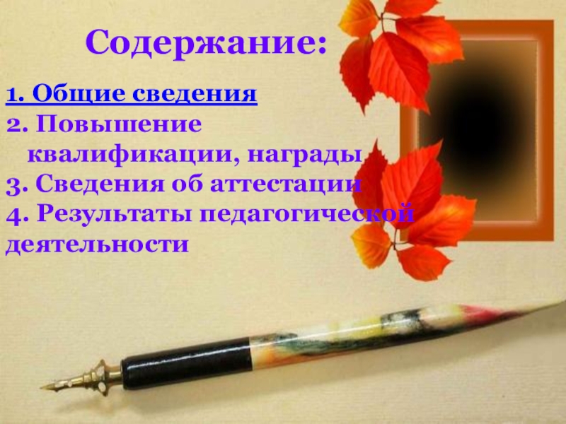 Содержание:1. Общие сведения2. Повышение квалификации, награды3. Сведения об аттестации4. Результаты педагогической деятельности