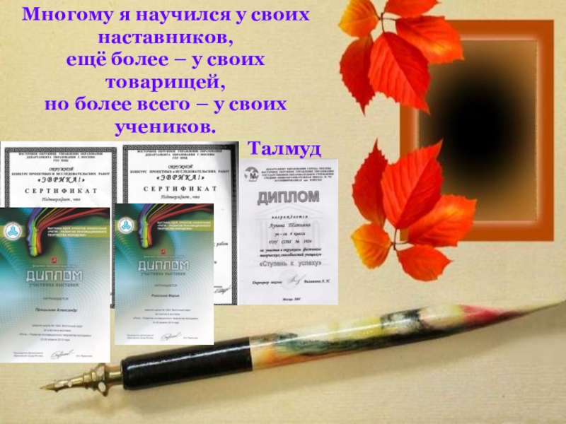 Слайд 13Многому я научился у своих наставников, ещё более – у своих товарищей, но