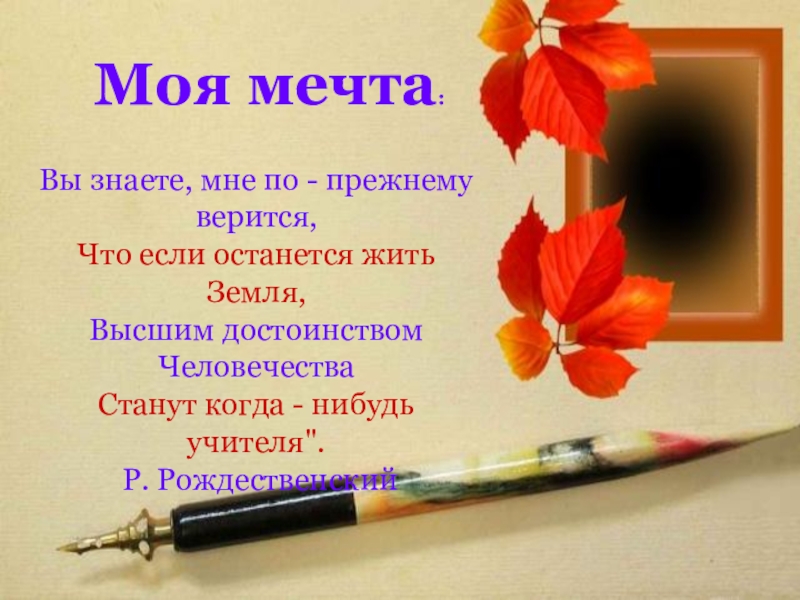 Моя мечта:Вы знаете, мне по - прежнему верится, Что если останется жить Земля, Высшим достоинством Человечества Станут