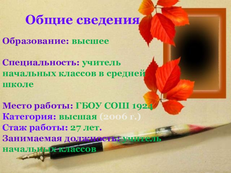 Общие сведенияОбразование: высшее Специальность: учитель начальных классов в средней школеМесто работы: ГБОУ СОШ 1924Категория: высшая (2006 г.)Стаж