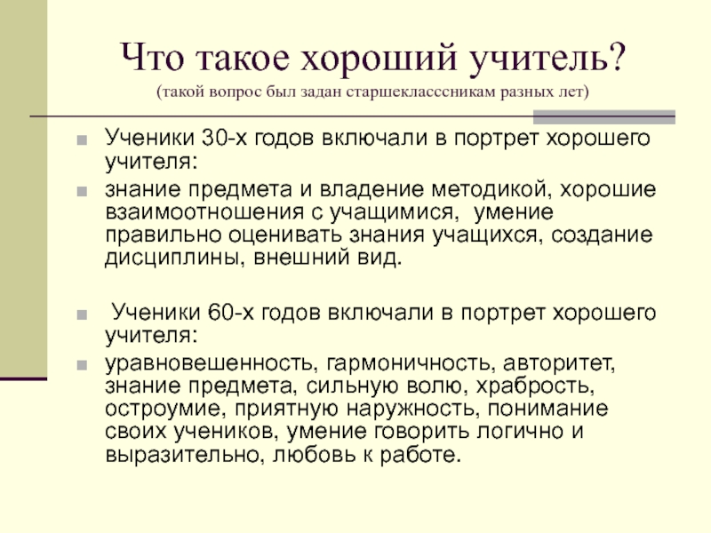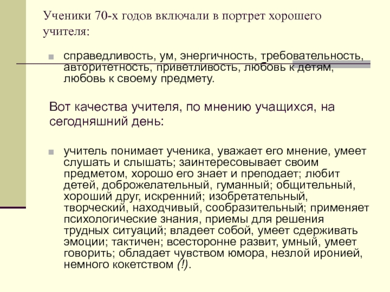 Слайд 4Ученики 70-х годов включали в портрет хорошего учителя: