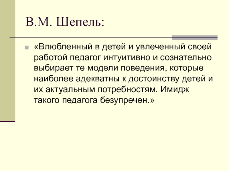 сознательно выбирает те модели поведения, которые наиболее адекватны к достоинству детей и их актуальным потребностям. Имидж такого педагога безупречен.»