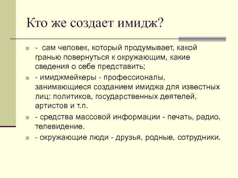 - имиджмейкеры - профессионалы, занимающиеся созданием имиджа для известных лиц: политиков, государственных деятелей, артистов и т.п.