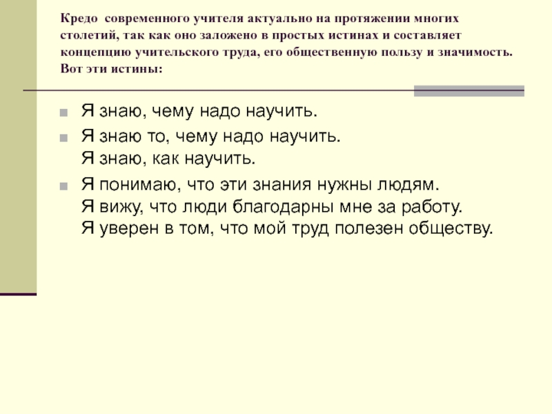 Кредо современного учителя актуально на протяжении многих столетий, так как оно