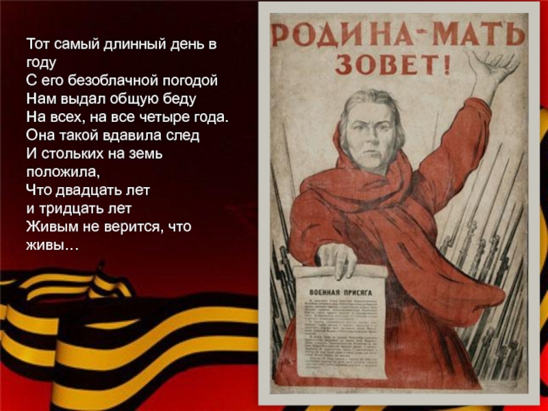 Тот самый длинный день в годуС его безоблачной погодойНам выдал общую бедуНа всех, на все четыре года.Она