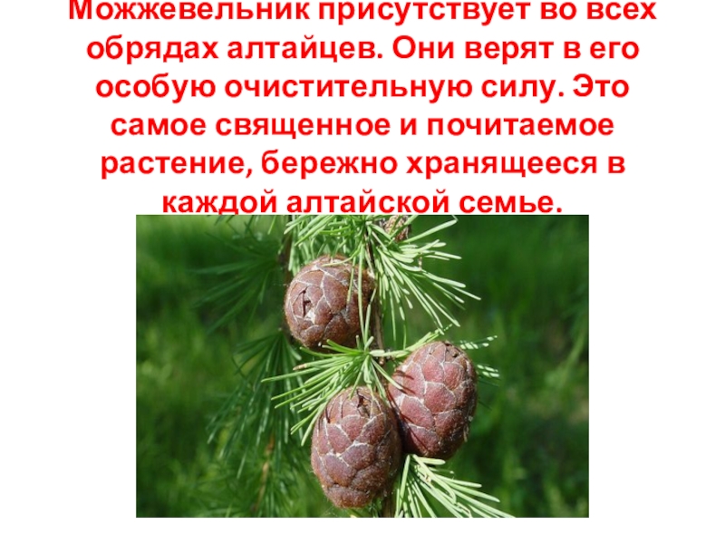Слайд 17Можжевельник присутствует во всех обрядах алтайцев. Они верят в его особую